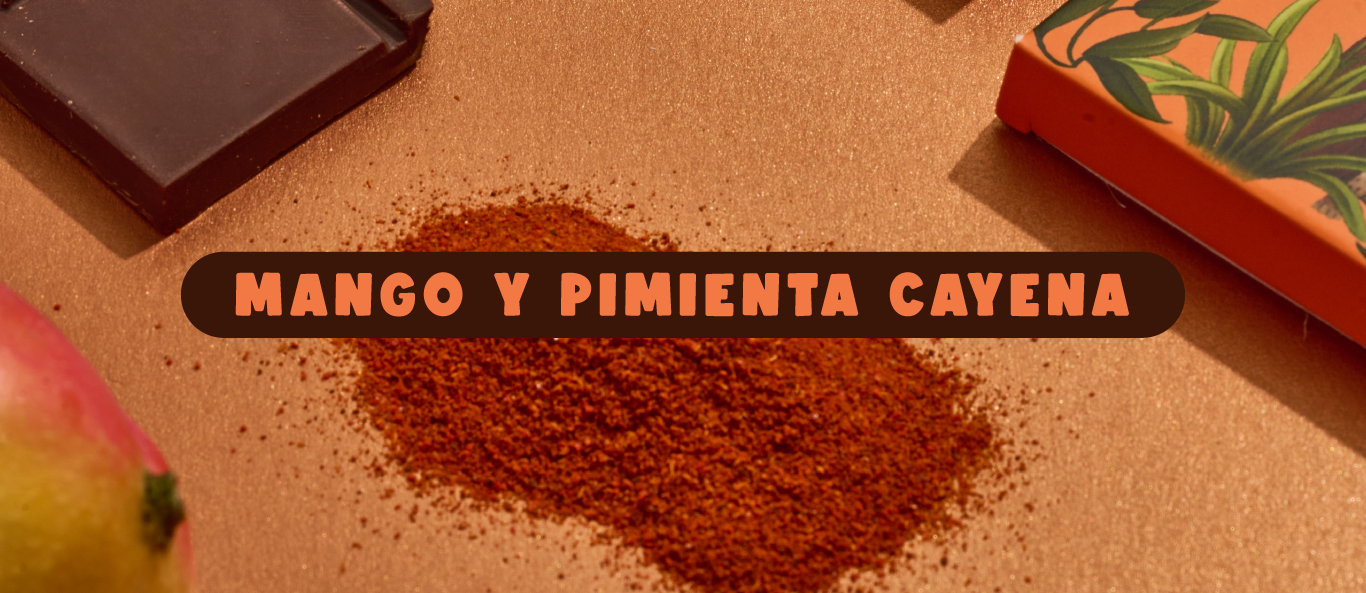 Ingredientes: chocolate oscuro 72% con mango en polvo y pimienta cayena.